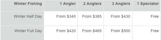 The package base cost is $895 for a half-day or $1095 for a full day for 1 angler. Add NZ $75 per day for each additional angler. A spectator may come along for an extra $20. Drinks and snacks are not provided as part of a winter trip so as to make the day more affordable for the client, however this can be organised for a small fee if required. Max capacity is 3 persons plus your guide. Please note that we consistently practice "Catch and Release" (refer "Key Fishing Information")
